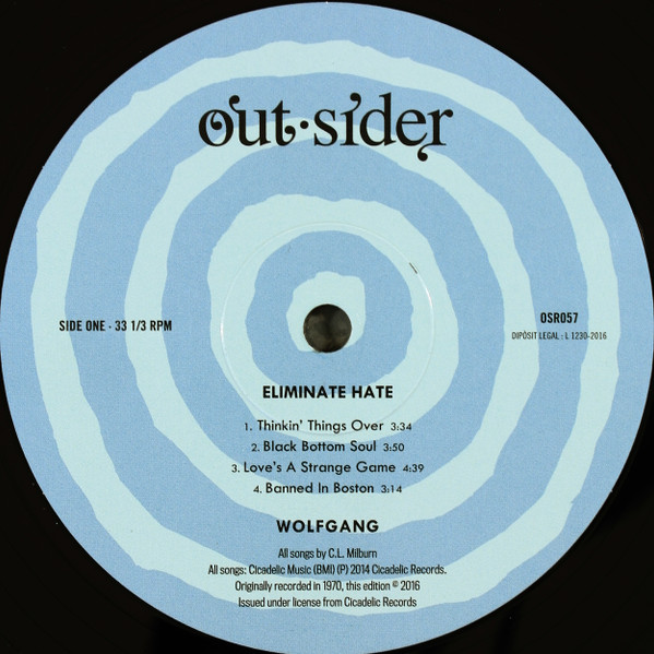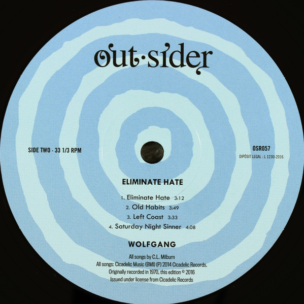 | After more than 30 years hidden in a dusty storage unit, Out-Sider present Eliminate Hate, the previously unreleased album from one of the most enigmatic bands from the Texas psychedelic scene, Wolfgang. An unusual blend of ’60s garage-punk, Texas psychedelia and ’70s pre-punk swagger. Awesome distorted steel guitar with super snotty vocals. Wolfgang were a young band from Pasadena, Texas, discovered by legendary Texas mogul C.L. Millburn. Little is known about the band and what exactly happened to them after recording this album. But, they were led by the great “Wolf”, Mike Long (Stone Axe, Josefus) and they also featured an unusual steel guitar player whose electrified sound recalls Glenn Campbell at his best. In 1970, Wolfgang recorded a set of songs written by Milburn, originally intended as demos to secure a deal with a bigger company. Eight songs were taped using Milburn’s trusty Sony two-track reel-to-reel. The major company deal never came so the tapes were stored at the Sea Ell archives for many years and Wolfgang disappeared in the mist of time.