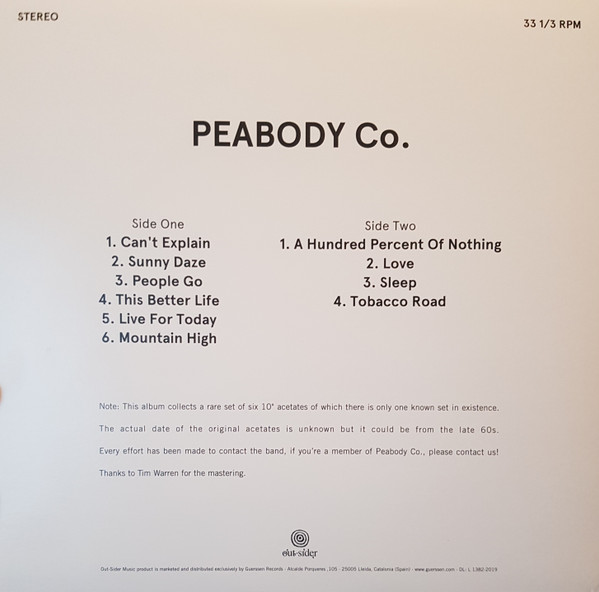 Famous for their freaked-out ride down “Tobbaco Road” (included on the now legendary A Fistful Of Fuzz comp), Peabody Co. were a mysterious US band who left behind a set of 10″ acetates, collected here for the first time. Late ’60s acid-punk/garage-psych, featuring seven self-penned songs plus three terrific cover versions of “I Can’t Explain” (The Who), “Let’s Live For Today” (Rokes/Grass Roots) and the aforementioned “Tobbaco Road” (based on the Blues Magoos cover, but including an extended crazed theremin/drum freak out!)